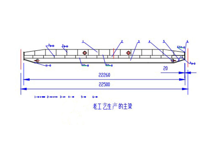 電動單梁起重機主梁原來主要采用U型槽加筋板焊接工字鋼,然后焊接兩側板再聯(lián)接端梁的方式制作。該工藝缺點是U型槽生產(chǎn)效率低、勞動強度大、焊接費用高、焊接工序耗時較長,焊接變形量大,焊接過程產(chǎn)生較多電焊煙塵,污染嚴重,在進行多段拼板、焊接、整形的過程中,焊接質量難保證,時有主梁橫向焊縫產(chǎn)生裂紋缺痕。